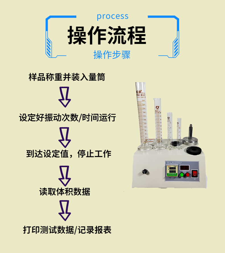 是粉體質量其中一個重要指標,振實密度測量,是指將一定量的粉體裝入容器中,在一定條件下振動,直到容器中粉體體積不再減少,讀出粉體的體積,然后用粉體的重量除以該體積就得到振實密度。