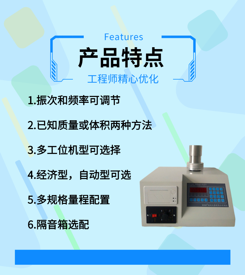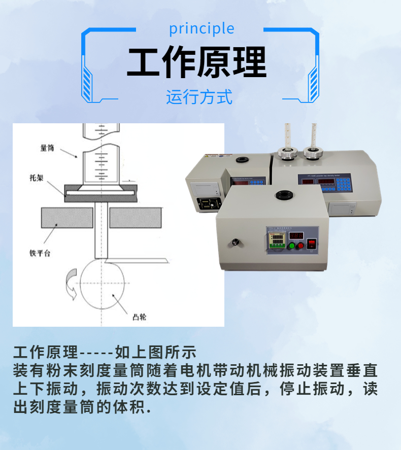對(duì)粉末和顆粒振實(shí)密度、松裝密度、堆積密度、安息角(休止角)、質(zhì)量流速、體積流速項(xiàng)目測(cè)量,綜合反映粉體流動(dòng)性和表征特性狀況,通過卡爾指數(shù),豪斯納比指數(shù)綜合評(píng)定物料流動(dòng)性狀況.