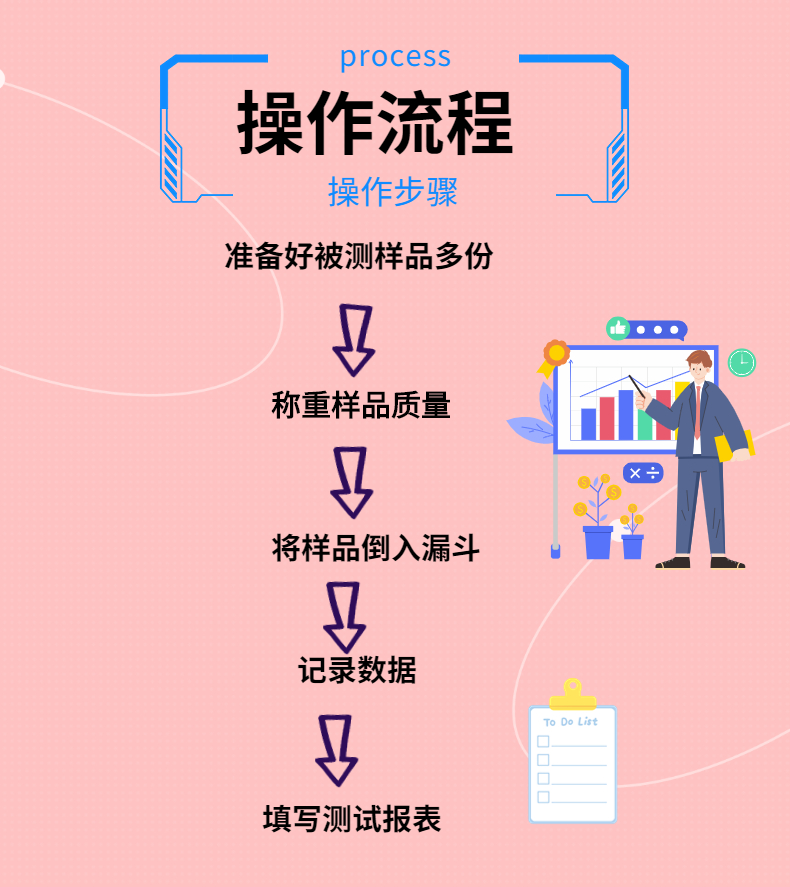 測試粉末和顆粒通過漏斗的時間和形成的角度,測試前進行預堆積,從而已知樣品量,將已知質量粉末從漏斗流出而形成的堆積角,以及流出所需要的時間;可以獲得休止角和流速數據。